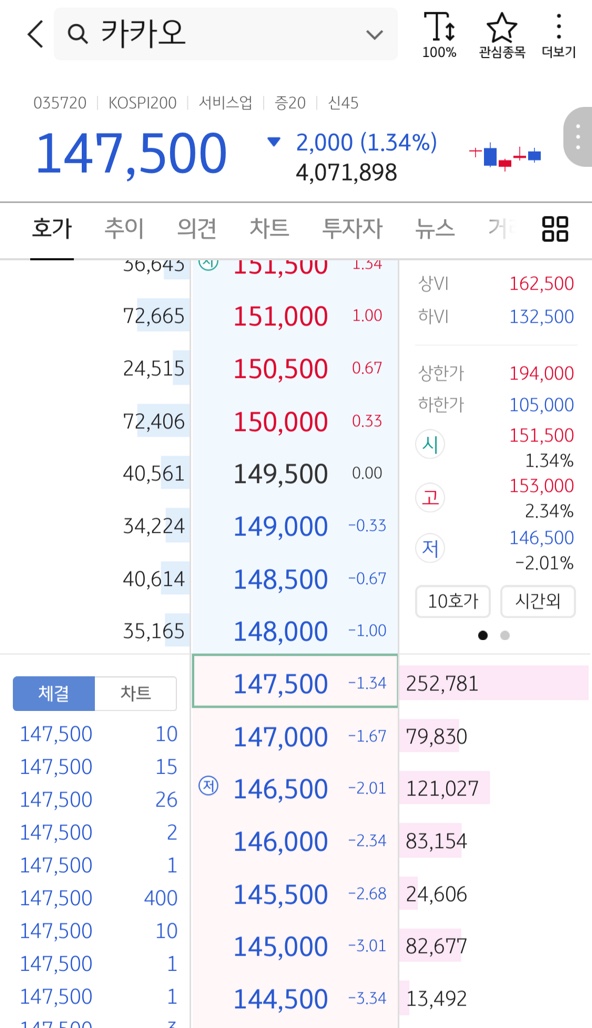 카카오의 주가는 이 사이에 위치하기 때문에 500원 단위로 움직인다.