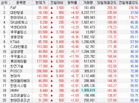 체결강도는 매수체결량 / 매도체결량으로 100이 기준