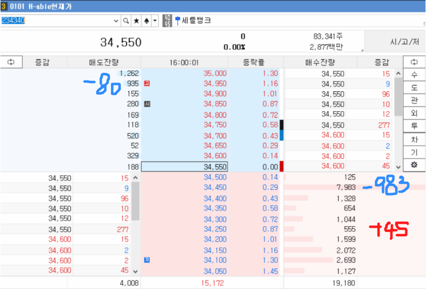 가끔 호가창을 장이 열렸을 때 실시간으로 보면 다음과 같이 잔량 옆에 숫자들이 뜬다.