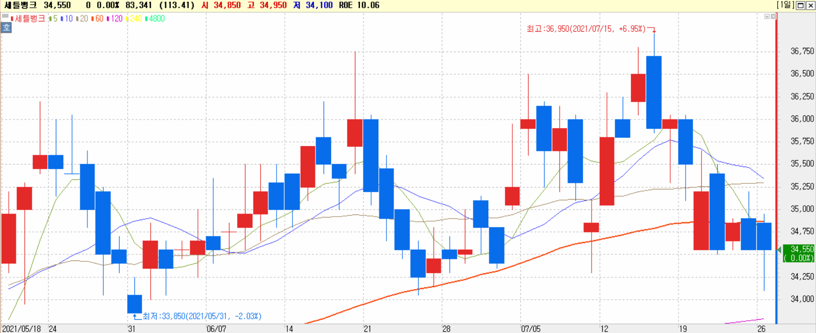 하락세를 나타내지만 아래꼬리를 달고 있어 바닥권에서 매수가 들어와 반등할 가능성